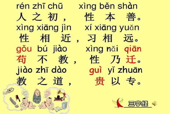 “人之初,性本善。性相近,习相远。苟不教,性乃迁。教之道,贵以专------”三字经可是难得的诗经,它里面包含了大量的仁义礼教,对于成长期的儿童来讲,是很不错的教材,很多家长朋友喜欢拿它来教育孩子,而且大多数幼儿园也会将“三字经”作为教课教材。“三字经”中包含了太多的仁义礼教的故事,比说《孟母三迁》、《孔融让梨》、《孟母断机》、《五子登科》、《黄香温席》、《尧的传说》、《舜的传说》、《大禹治水》等等,下面,为大家带来三字经全文朗读(带拼音),小朋友们赶快学习起来吧。