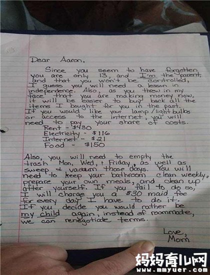 妈妈听了当然十分愤怒与心寒,她决定写封信教导儿子什么才算真正的独立,把买给他的床垫、玩具、衣服都没收,并且把这封信贴在他的房门上。