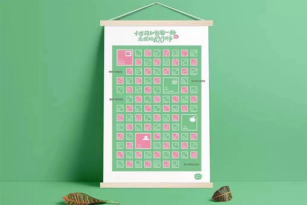 “十岁前和爸爸一起完成的100件事”卷轴挂画一共分为两层,每一层都有100个格子,分别代表的是100件事。第一层的格子代表的是爸爸和孩子需要完成的任务,而第二层写着做完这个事情之后会得到的奖励。