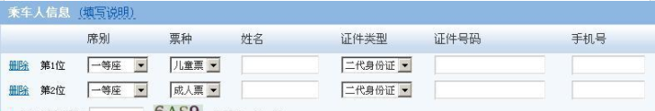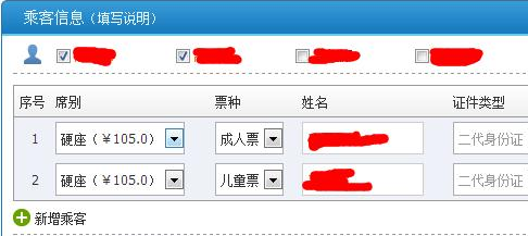 3.您只要在2个姓名前打上勾,就表示您同时购买两张一模一样的票,一张是成人票,一张是儿童票;打了勾之后,会出现以下界面。
