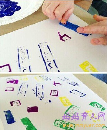 步骤:1、把积木底部或正面粘上颜料;2、盖印章一样盖起来;3、颜料干了就完成了!