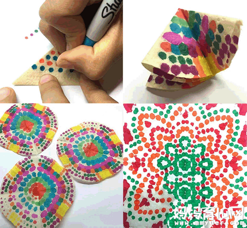 选薄的纸巾,对折后用彩笔在上面点画,稍微用点力,让颜色渗透打开之后,美丽的图案就出现了。不光好看,也让孩子们了解颜色,感知形状,明白对称,一举多得。