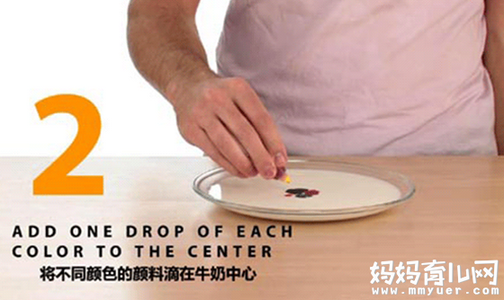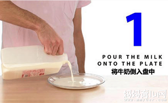 这个实验用到的东西都很常见,但很少有爸爸妈妈知道。首先,将牛奶倒入盘子中。