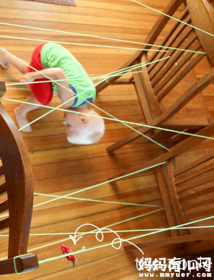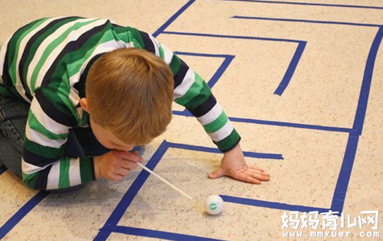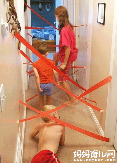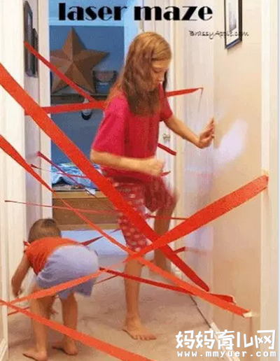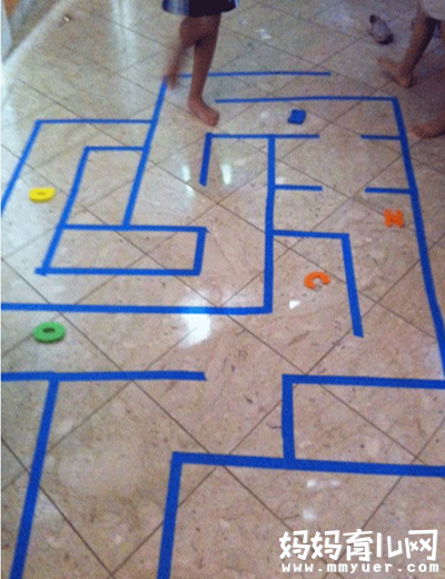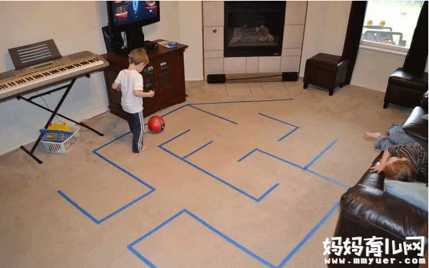 家里有过道的话可以用胶带纸设置成这样的障碍穿越,孩子们一定非常喜欢。没有过道,凳子也是一个不错的选择。