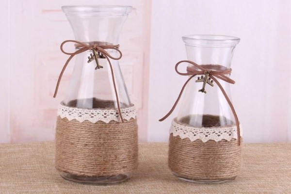 3、如果家里有玻璃奶瓶的,还可以将奶瓶做成花瓶。现在比较流行的麻绳,用胶枪将麻绳一圈一圈缠绕在奶瓶上,不一会功夫,一个小清晰的花瓶就做好了。