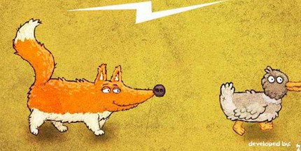 狡猾的老狐狸,慢慢地漂到了鸭群中间。它猛然抬起头,露出大牙,向鸭群左咬右咬,进行猛烈地侵袭。两只肥美的小鸭子,首先成了它的攻击目标。它一口叼上它们,就匆忙地逃走了。其余的鸭子被吓得尖叫着飞走了。很久,它们都没敢再飞回到这儿来。