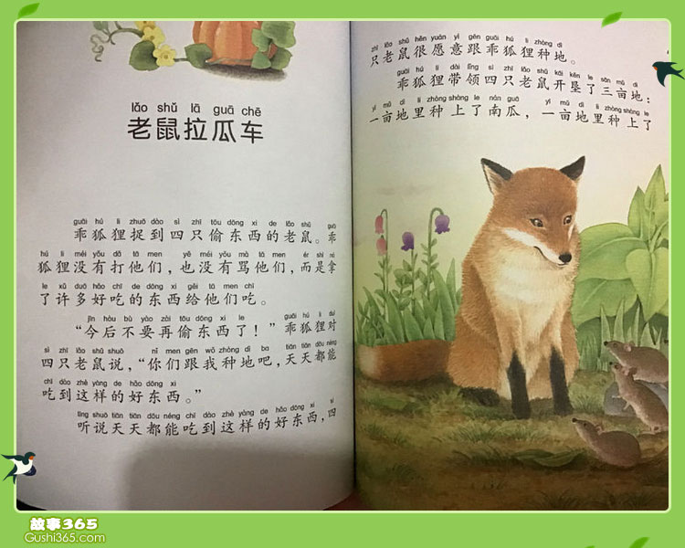 乖狐狸捉到四只偷东西的小老鼠,乖狐狸没有打他们,也没有骂他们,而是拿了许多好吃的东西给他们吃。“今后不要再偷东西了!“乖狐狸对四只老鼠说,“你们跟我种地吧