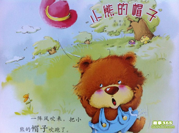 小熊戴着一顶粉红色的帽子出去玩,一阵风吹来,把小熊的帽子吹跑了。