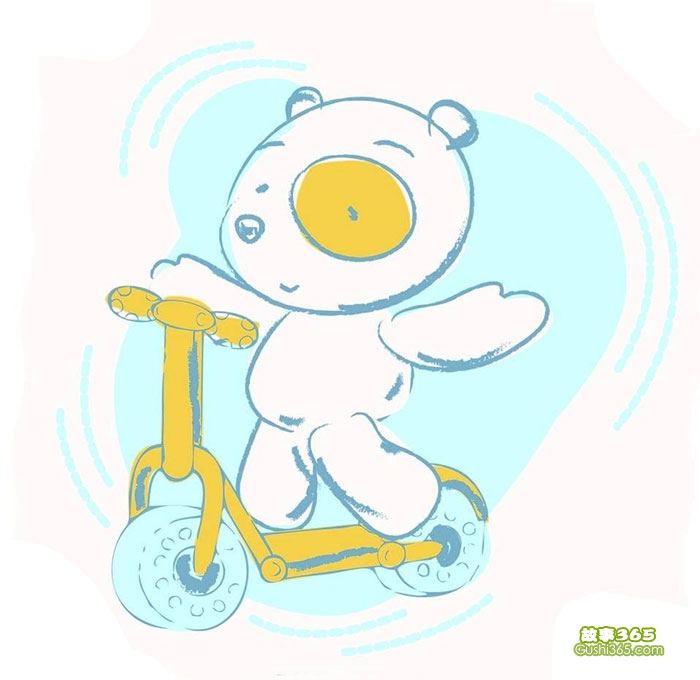 蹬滑板车老摔跟头怎么行呢?小猴对小熊说:“你的眼睛不好,在滑板车的前面装个小喇叭吧!”