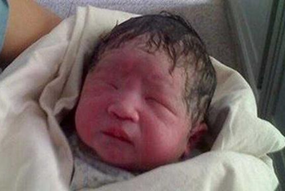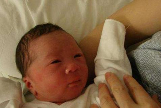 这孩子刚刚从产房抱出来的,头发湿湿的,脸上的皮肤也是红红的,眼睛都还没睁开。