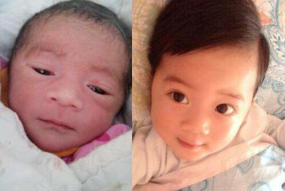 最后,咱来一张刚出生和后面的对比照片,讲真幸好是“盼若两人”,从小老头变成了小帅哥。