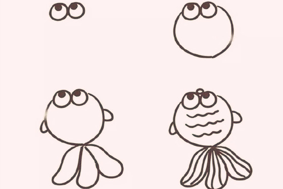 这款小金鱼画法也超级简单,先画出它的眼睛,两个大圆圈加两个实心小圆圈,再画出金鱼的头部,接着是金鱼的尾巴和花纹。
